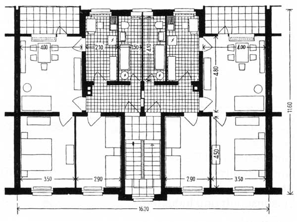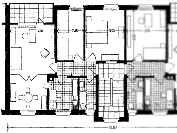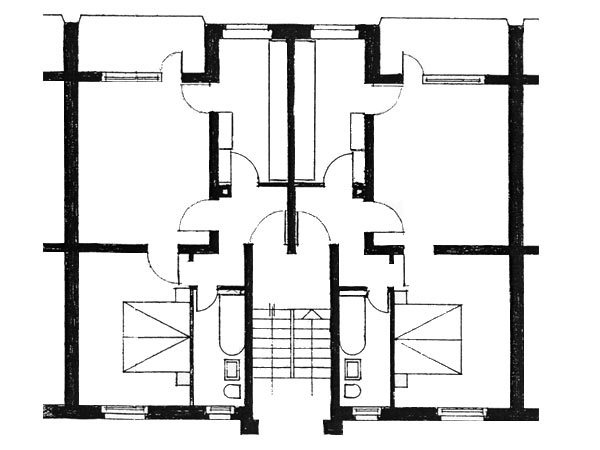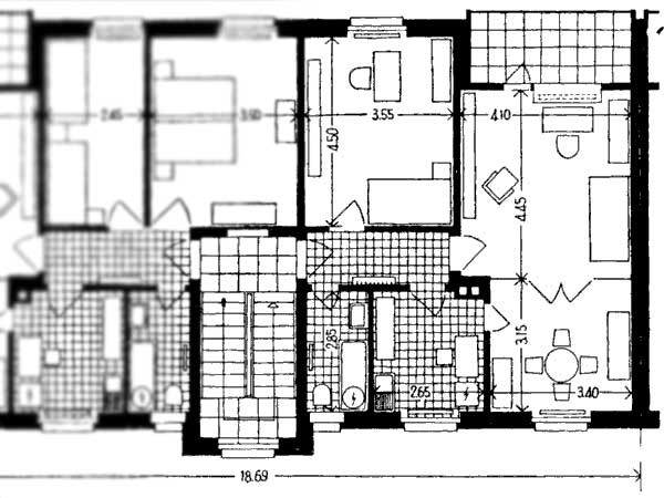 Die kurzen, parallelen Wohnblöcke haben alle Ost-West-Ausrichtung, welche von einer zentralen Liegenschaft in Nord-Süd-Orientierung durchbrochen werden.